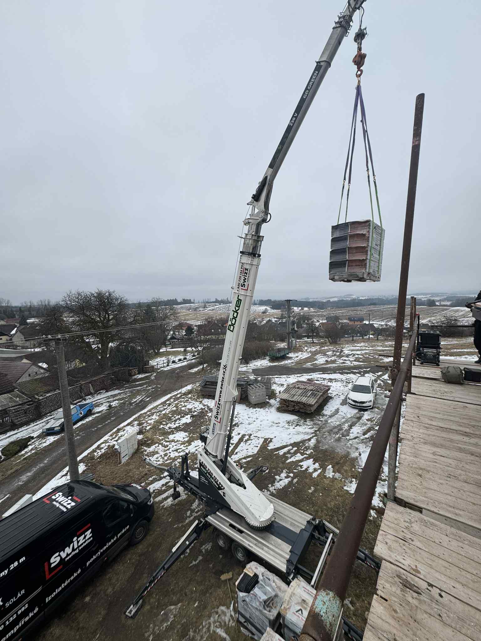 Zvedání PUR panelů, stavebních materiálů a těžkých břemen do vyšších pater.